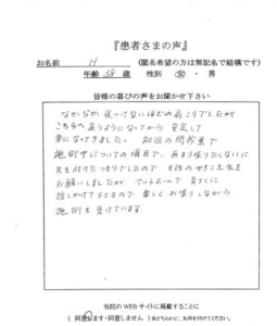 Hさん38歳女性。なかなか寝付けないほどの肩こりでしたので、こちらへ通うようになってから安定して楽になってきました。初回の問診内容で、あまりしゃべりたくないことがありましたので、女性のyukiko先生にお願いしました。アットホームで気さくに話しかけてくれましたので、話も楽しくおしゃべりしながら手術を受けながら、良くなりました。